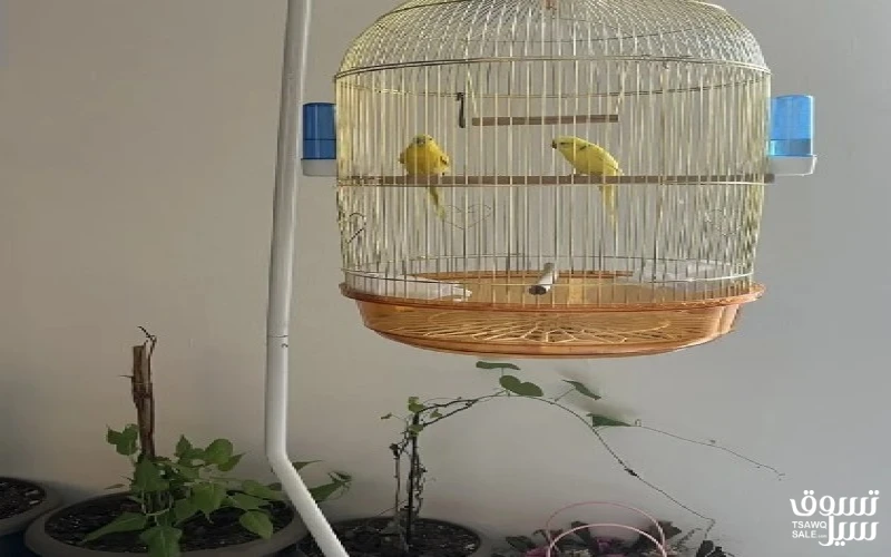 2 yellow birds with golden cage with stand and 2 water dispenser Price mentioned for cage with stand and water dispenser.