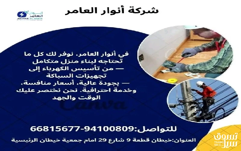 أنوار العامر... شريكك المثالي في تأسيس وتشطيب المشاريع الكهربائية والصحية" #كهرباء #صحي #مواد_بناء