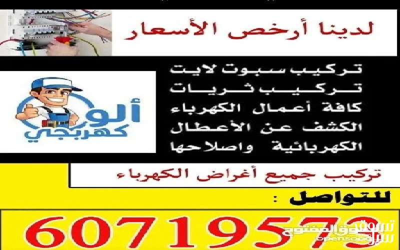 الوصف فني كهرباء خدمة منازل تركيب وصيانة جميع الأعمال الكهربائي تصليح الأعطال الكهربائية ت/ إضغط ليظهر الرقم.. 607195XX