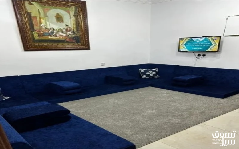 جلسة ارضية تفصال من إسفنج مضغوط وقوي وغطاء من القطيفة باللون الأزرق