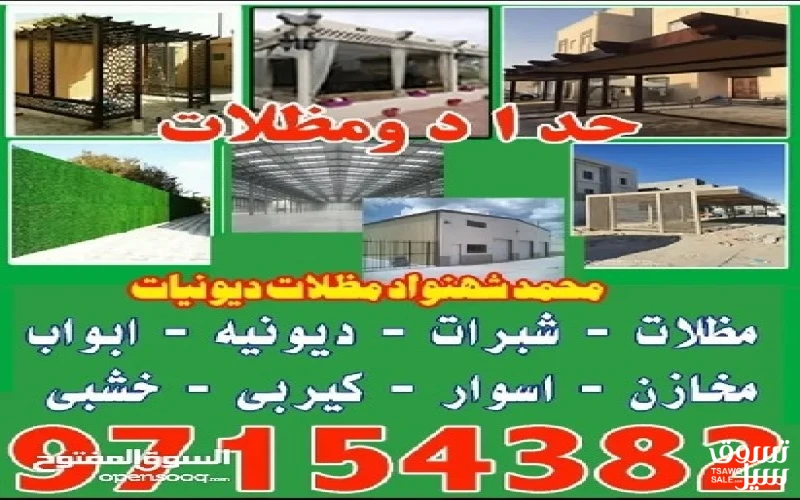 مظلات شبرات ديوانيه أبواب مخازن أسوار كيربى خشبى جميع أعمال الحداده