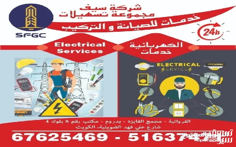 خدمات الصيانة والتركيب الكهربائي. تشمل عملية تركيب الأجهزة والأنظمة الكهربائية الجديدة، بما في ذلك الأسلاك، والقنوات، ولوحات التوزيع، والإضاءة، ومنافذ الطاقة. تشخيص وإصلاح المكونات والأسلاك والمعدات المعيبة. سكني:
