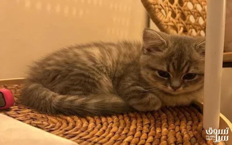 قطة أليفه صغيرة نوع برتش شورت هير لدواعي السفر مع بيت و لتر بوكس وألعاب وكرتون كامل علب أكل وجميع مستلزمات القطة