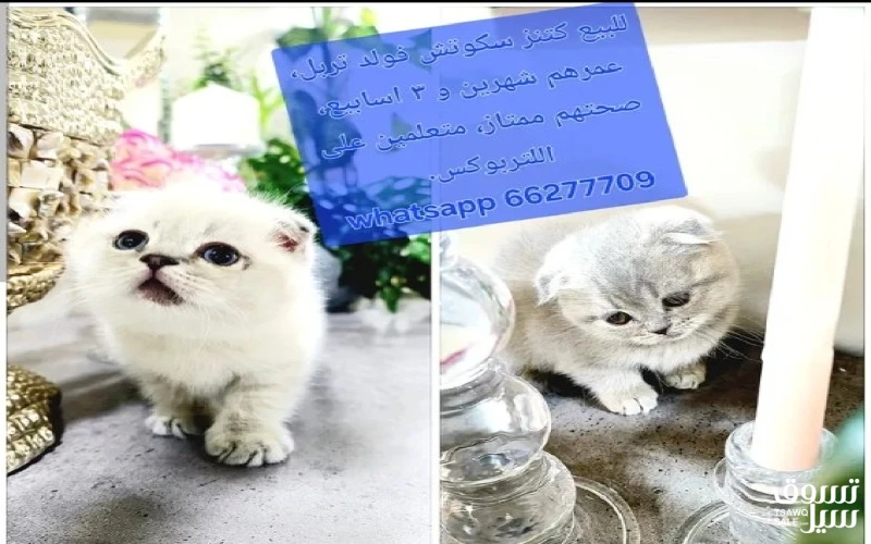 للبيع قطط سكوتش فولد بيور(تربل فولد)، عمرهم 3 شهور، متعلمين على اللتر بوكس، صحتهم ممتازه، ياكلون ويت و دراي فود. تواصل وتساب