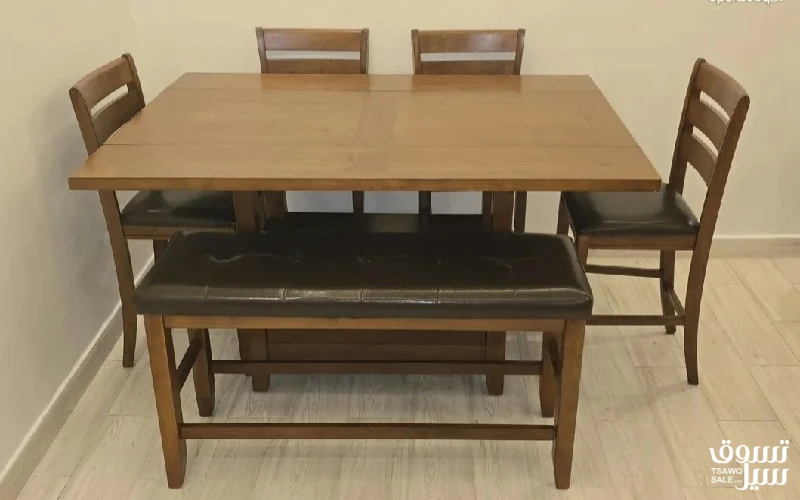 الطاولة بحالة ممتازة خشب وتنجيد كالجديد العدد: 4 كراسي + 1 بنش + 1 طاوله القياسات: 1 متر عرض × 1.53 طول ، ارتفاع 1 متر
