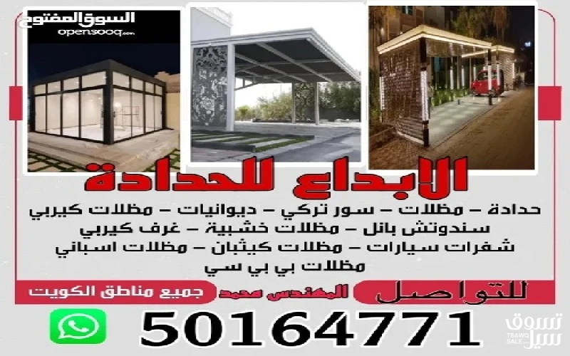 الوصف مظلات سيارات بجميع انواعها تربزين بجميع التصاميم اسوار حديد بيبان حديد مخازن ساندويتش فانيل محميات طيور محميات زراعيه مظلات خام بجميع انواعها قرميد معدن وقرميد فخار وعمل بيبان نقشه وديونيات بجميع مقاساتها والتصاميمها وتجهيز حدائق وعمل شاليهات متنقله وشاليهات ثابته بجميع مقاساتها مستعدين لاستلام مشاريع كبيره ومتوسطه وصغيره ونعم في
