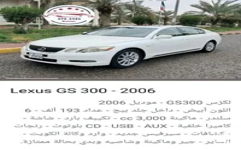 لكزس GS300 - موديل 2006 اللون أبيض - داخل جلد بيج - عداد 193 ألف - 6 سلندر - ماكينة 3,000 cc - تكييف بارد - شاشة - كاميرا خلفية - CD - USB - AUX بلوتوث - رنجات - كشافات - سيرفيس جديد - وارد وكالة الكويت - الساير - جير وماكينة وشاصيه وبدي بحالة ممتازة. ------------