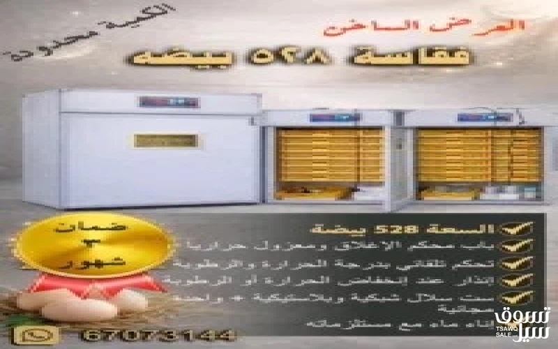 للبيع فقاسات صينيه اوتوماتيكيه ، باب محكم الاغلاق ومعزول حرارياً ، تحكم تلقائي بدرجة الحرارة والرطوبة ، إنذار عند انخفاض الحرارة والرطوبة ، ست سلال شبكية بيضاء و بلاستيكية صفراء