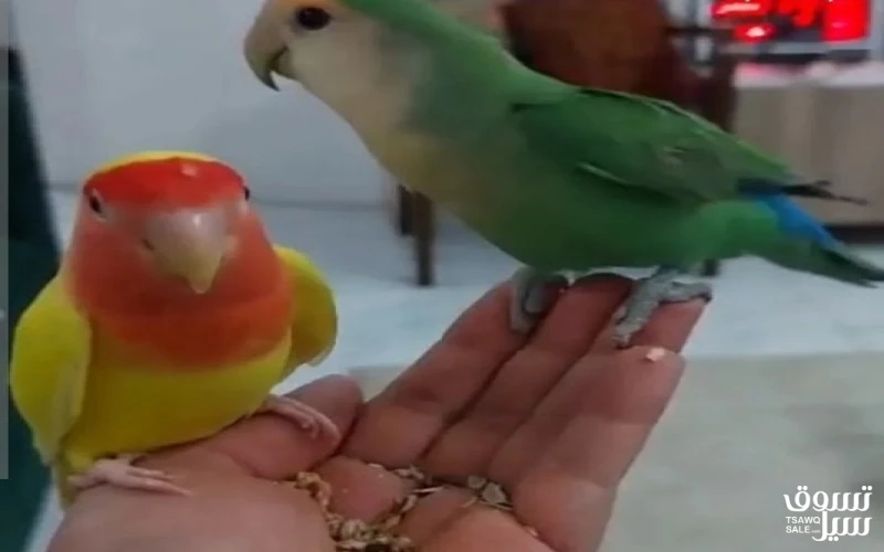 للبيع جوز طيور لوف بيرد بصحة ممتازة، شامل القفص وكيس أكل — For sale: a healthy pair of lovebirds, including cage and a bag of food.