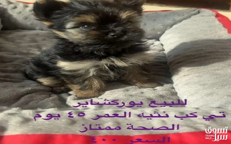 كلب نوعه :يوركشاير تي كب انثى العمر:45 يوم السعر 400 الصحة ممتازة وقاعدة تتعلم على الباد