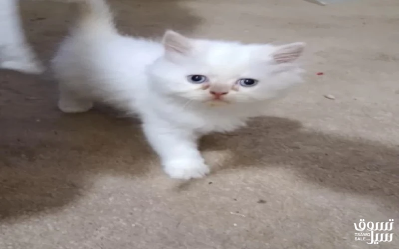اللون ابيض والعيون ازرق فاتح العمر شهرين الفصيله شيرازي الحاله الصحيه ممتاز خالي من الامراض والحشرات انتاج بيت