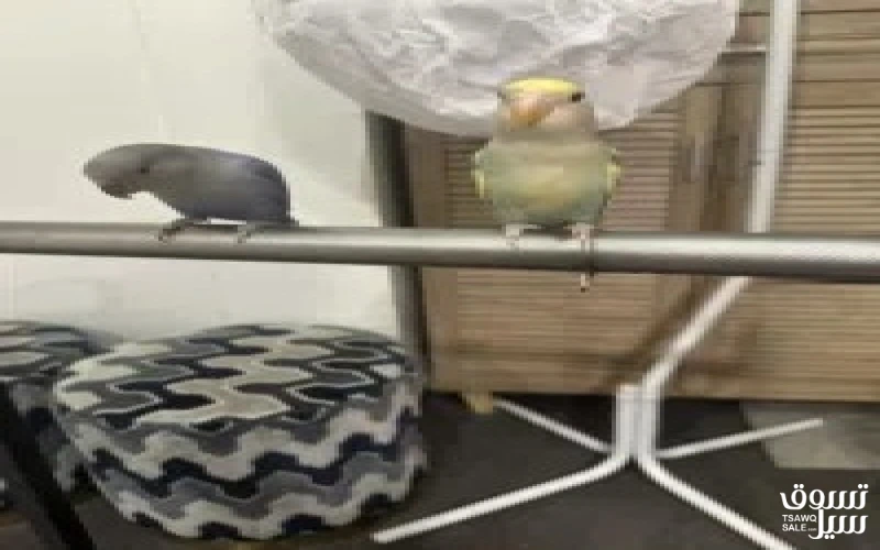 للبيع طيرين لوف بيرد ربوه مقصوص جناحهم مافيهم عض مع قفص معلق باستاند واستاند منفصل كما هو موضح بالصور