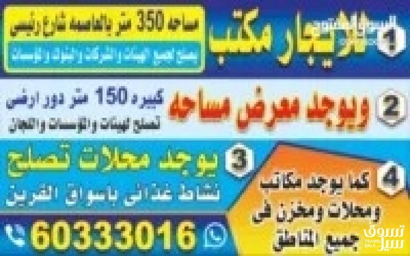 لايجار مكتب تجارى شرق شارع احمد الجابر يصلح لجميع الشركات موقع مميز بركن سيارات كبير يوجد محلات بالعاصمه والسالميه تصلح جميع الانشطه إضغط ليظهر الرقم.. 603330XX