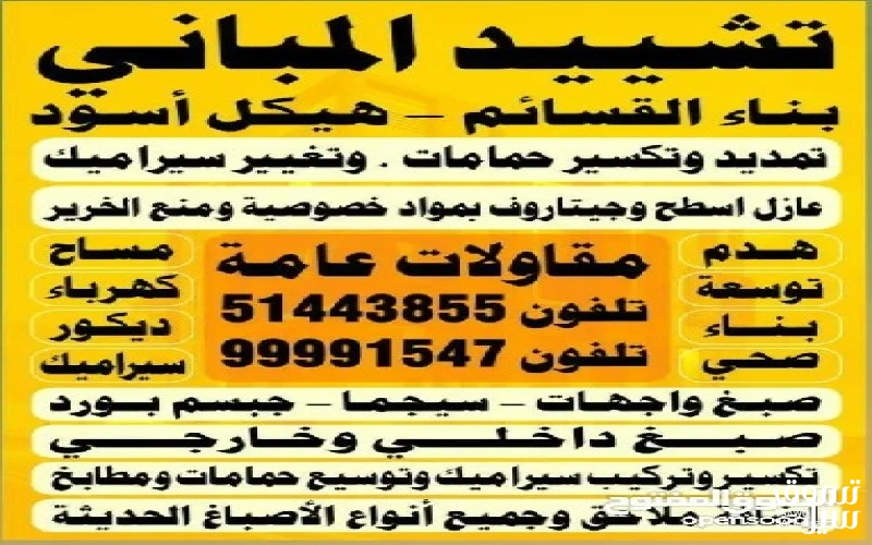 نقوم بأعمال (تشييد المباني) بناء القسائم- هيكل اسود- ترميمات عامه- هدم -توسعه -مساح -كهرباء -ديكور