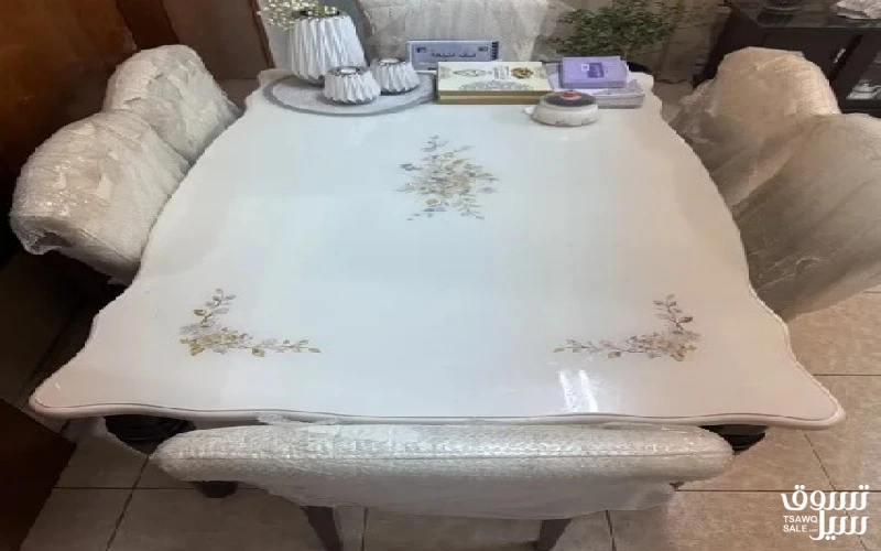 سفرة طعام ست كراسي شبه جديد استعمال عائله صغيره الكراسي الى الآن مكيسه اللون ابيض