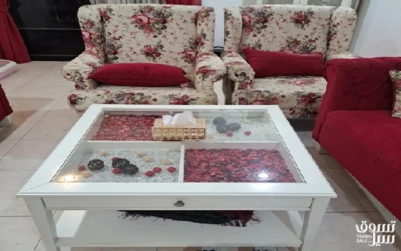 طقم صالون مكون من 5 قطع ( 4 كنبايات وطاولة الوسط مع البرادي) السعر : 120 رقم التواصل : Click to show phone number.. 690203XX عن طريق مسجات الواتساب فقط