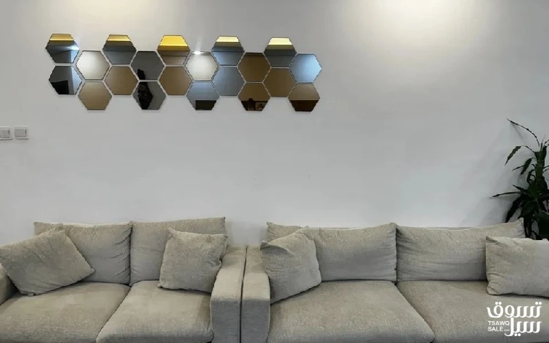 طقم 5 مقاعد استعمال خفيف من هوم سنتر وطقم ثاني استعمال خفيف 10 مقاعد طاولة طعام رخام ثقيل و قوي بحالة ممتازة 2 طاولة خشب فاتح وحدة تلفزيون كبيرة