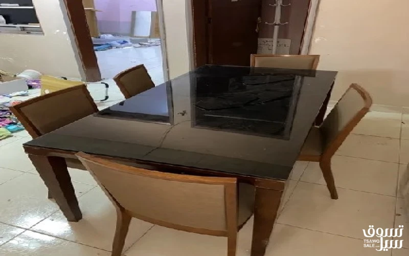 عدد 1 طاولة عليها لوح زجاجي وعدد 6 كراسي
