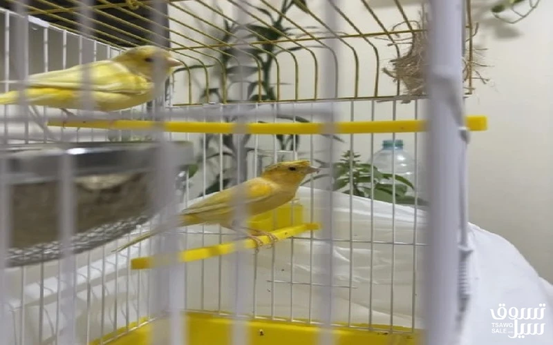 زوج كناري سوري اصفر الذكر مطربش مغرد جاهزين للبيض مع قفص جديد والاغراض كاملة السعر 25 .